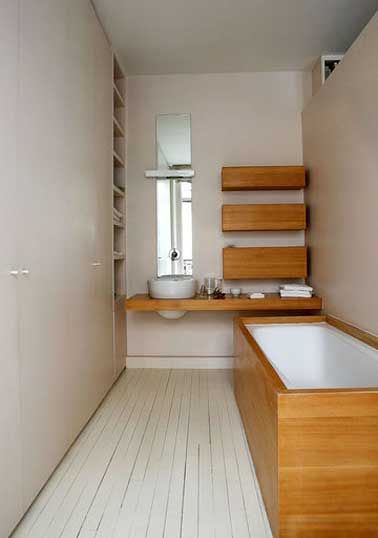 Petite salle de bain mais grande classe avec l’habillage de la baignoire en bambou ! Le sol en parquet blanc et les murs en tadelack lin créent une unité entre le sol et le plafond pour agrandir la pièce. La couleur chaleureuse du bambou placée sur le plan de vasque et les étagères réchauffe la déco et rythme l’espace dans cette salle de bain. Bonne astuce rangement pour une petite salle de bain : la niche avec ses étagères de rangement formant une verticale « poussant » le plafond.