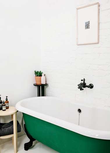 La peinture baignoire, une astuce qui fait coup double lors du relooking de la salle de bain. Elément central du décor, la couleur verte appliquée sur la baignoire îlot dynamise le blanc du mur de briques repeint et du sol. En touches, la couleur noir sur la robinetterie et les pieds de la baignoire apportent une note contemporaine dans cette petite salle de bain.