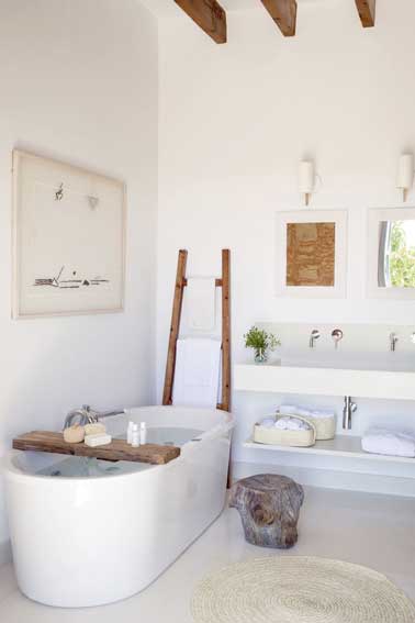 La petite salle de bain s’habille de blanc du sol au plafond pour créer un espace clair et lumineux. Cette belle unité donne une ambiance apaisante accentuée par les lignes zen de la petite baignoire îlot. La couleur du bois brut des poutres reprise par l’échelle porte-serviette, le tabouret et le plateau de baignoire ajoute de l’authenticité à la déco.