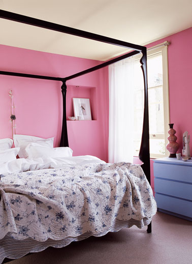 Dans cette chambre, rose vif, rose pâle, vieux rose et bleu clair s’associent pour un effet lumière réussi.