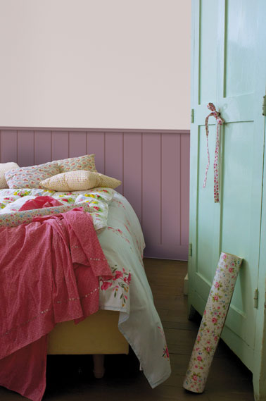 Du rose pour une ambiance féminine et la décoration de cette chambre d'ado. Le soubassement en bois est souligné avec une peinture de couleur vieux rose, en contraste, la porte peinte en vert d'eau apporte une note de fraicheur