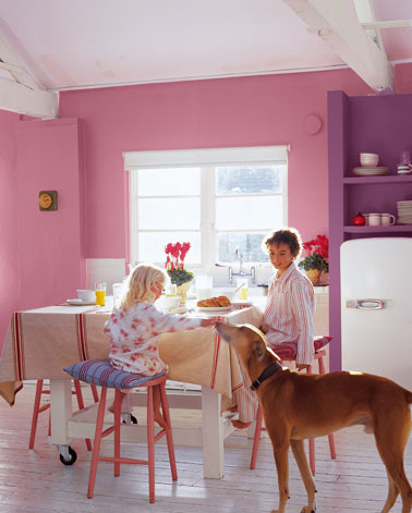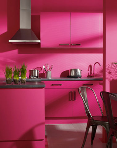 Une peinture mur rose vif et du violet pour les étagères de la cuisine ça marche ! Photo : institut couleurs et déco Astral