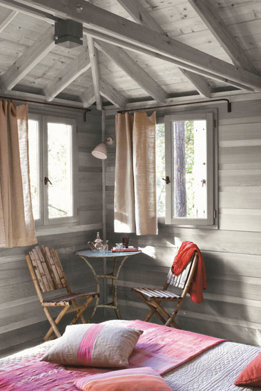 Décoration d'une chambre gris et rose pour une ambiance douce et apaisante. Murs et plafond en planches lasurée grise s'harmonise avec le rose tendre des rideaux et le plaid et les coussins de lit gris et rose plus soutenu.