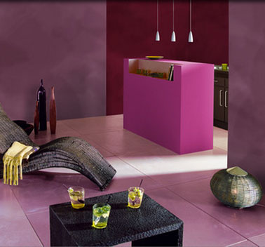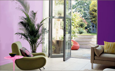 Une décoration aux couleurs vitaminées avec en peinture murale le rose Bali expression et le violet Bali intense de la collection Couleurs du Monde Dulux Valentine. En contraste, fauteuil revêtement vert