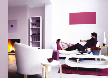 Une couleur rose et du violet créent une ambiance romantique que l’on peut décliner à volonté avec les accessoires: coussins, plaids, rideaux, vases…