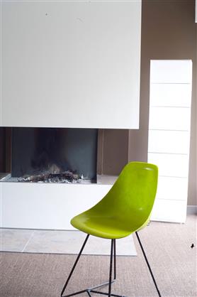 Les couleurs neutres dans le salon c’est indémodable et bien confortable. Pour casser l’impression de repos monacal qui peut déplaire à certains, il suffit d’apporter une couleur vive et le tout devient très contemporain ! Dans ce salon, c’est la couleur de la chaise, d’un vert citron, chaud et vivifiant qui contraste avec la peinture murale blanc grisé en premier plan et le taupe du mur du fond. Couleur peinture : taupe ref T237-1 nuancier Totem de Tollens.