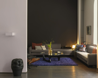 Pour une déco de salon intimiste et accueillant, misez sur les harmonies de gris pierre et taupe et complétez la par une couleur intense et lumineuse. Dans ce salon, le tapis de laine violet foncé apporte contraste et luminosité auprès du gris pierre et du taupe foncé qui couvre le mur du fond. Couleurs peinture : long Island intense gamme Couleurs du Monde, Gris d’Orage aspect mat de Dulux Valentine.