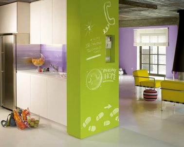 Salon et cuisine dans loft couleur vert pomme et parme. Carrelage couleur lin. Peinture Dulux Valentine
