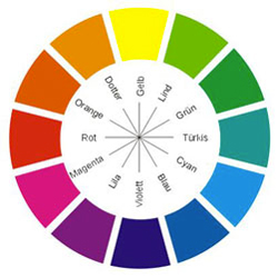 Couleurs salon en harmonie, exemples : Bleu, violet, et vert. Couleurs en contraste : Orange jaune et bleu.