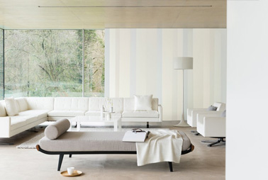 Plutôt qu’un papier peint sur le mur du salon, des rayures de couleur discrètes de gris perle, lin naturel et poudre d’ivoire créent un rythme tout en subtilité . Peinture Dulux Valentine