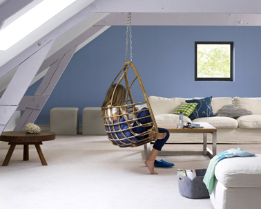 Pour la déco d’un salon bleu, un belle association est faite avec du parme et des couleurs naturelles pour une ambiance qui rappelle la douceur et le calme d’une maison de bord de mer. Notez la subtilité des couleurs qui recouvrent les poutres : blanc, ciel de parme et gris embruns. Pour apporter un peu de contraste, les coussins couleur Lapi Lazuli, un bleu intense et une discrète mais efficace touche de vert apportée avec le coussin sur le canapé.