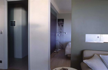 Dans ce petit appartement où salon et chambre se côtoient, c’est une harmonie de coloris gris ponctuée d’une teinte de mauve plus soutenue qui est travaillée pour séparer chacun des volumes par la couleur tout en donnant une cohérence aux espaces en enfilade. A noter la niche éclairée par des spots LED au dessus du canapé qui diffusent une ambiance feutrée et évitent d’encombrer le volume avec des éclairages d’appoint. Peinture : Gris : T2028-6, Violet 2096-1 Nuancier Totem de Tollens.
