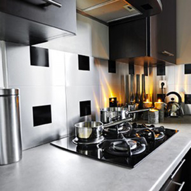 Top design la cuisine avec sa belle crédence alu réalisée avec des carreaux adhésifs. Vendus en lot de 3 panneaux de 0,5mm, ces carreaux adhésifs s’entretiennent simplement avec une éponge et sont faciles à découper au cutter. Résistants à l’humidité et à la chaleur, ils trouvent naturellement leur place près des plaques de cuisson et forment une déco de crédence cuisine ultra moderne. Le plus déco : La finition intox brossé, ajoute une touche design à la pièce.