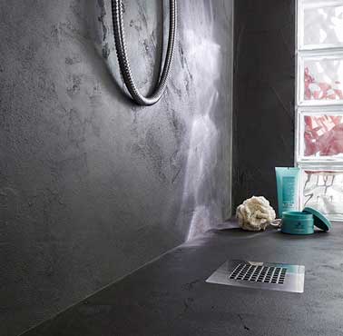 Avec son aspect lisse et mat le béton minéral est parfait pour relooker une salle de bain. Ici le coloris gris crée une belle unité dans la douche italienne.