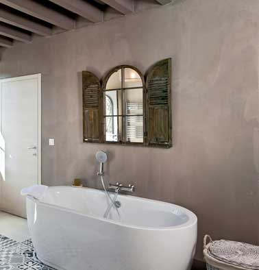 Comme un béton ciré sur carrelage, l’enduit minéral s’applique sur de nombreux supports muraux et meubles y compris sur les murs de la douche, et pour recouvrir le receveur de douche italienne. Le béton minéral a l’art de créer une salle de bain zen hyper déco, sans fioritures propice à la détente.