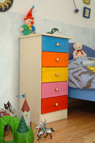 Avec un nuancier de 31 couleurs pour la peinture en bombe, il est facile de repeindre les tiroirs d’une commode de plusieurs couleurs pour un effet ludique dans une chambre d’enfant. Peinture Julien