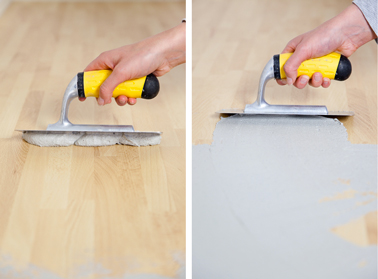- A l’aide d’une taloche appliquez une couche généreuse de l’effet pierre sur le plan de travail en commençant par les champs et poursuivez par la surface plane en ayant soin de commencer par une extrémité et de toujours travailler dans le sens de la longueur pour rejoindre l’autre extrémité du plan de travail. L’épaisseur d’effet pierre doit être généreuse et uniforme. Ensuite, laissez sécher pendant 4 heures.