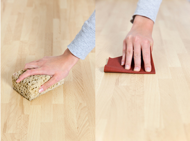 - Pour un plan de travail stratifié, en bois verni ou mélaminé commencez par lessiver le support à l’aide d’un nettoyant à base de carbonate de sodium, le plus connu la lessive Saint Marc et bien rincer. Après séchage complet, egrenez le plan de travail avec un papier de verre moyen (240gr) puis dépoussiérez soigneusement avec un chiffon humide ou un aspirateur.