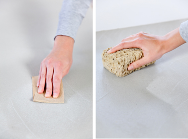 - A l’aide d’un papier de verre de 240 g poncez puis dépoussiérez avec une éponge humide.