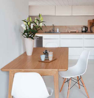 La première couche se fait assez épaisse. Commencer par les angles et bord du plan de travail à l’aide d’un pinceau plat puis continuer au rouleau en prenant soin de bien le charger en vernis. Pour éviter les traces bien peindre dans le sens du bois ou du stratifié. Laisser sécher 4 heures. Egrener comme lors de la préparation du plan de travail puis appliquer la seconde couche de manière aussi généreuse que la précédente. La remise en service du plan de travail peut de faire après 24 heures de séchage. Attendre 20 jours pour un séchage à coeur, délais pendant lequel il est préférable de ne pas trop solliciter le support.