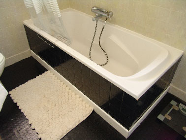 Peinture noire satin sur tablier en carrelage de la baignoire et enduit aspect béton gris sur faïence murale. Au sol, revêtement PVC pastille noir style métro chez Leroy Merlin. Photo : © Deco-Cool