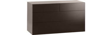 - La commode marron à trois tiroirs en panneaux de particules. Intérieur des tiroirs rouge. 242,75 € au lieu de 475 € (-50% soit 236,75 € d’économie) chez Habitat