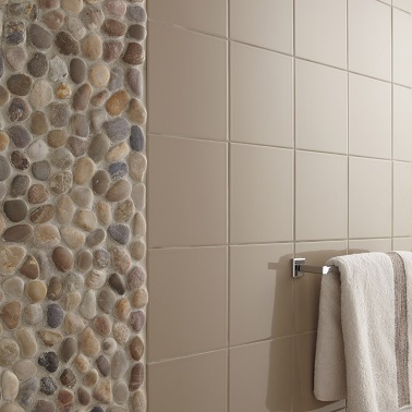 Poser une bande de galets sur le mur de la salle de bain pour se sentir comme sur les bords d’un lac. Photo : Leroy Merlin