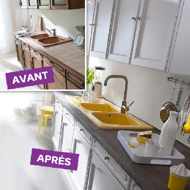 Dans la cuisine, une peinture pour repeindre les murs, les meubles et le carrelage, et voilà une cuisine toute neuve ! Photo Castorama