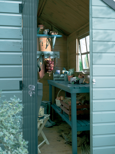 Une idée sympa pour repeindre l’abris du jardin en fer avec des couleurs qui sont reprises pour peindre l’établi et les étagères en bois, comme dans cet exemple avec la porte de la cabane peinte Vert Potager qui fait contraste avec le vert Provence mis sur les murs extérieurs. Peinture glycéro Protect’ Fer (prix 53.50 € le pot de 2.5L) . L’établi et les étagères avec la peinture pour bois extérieur.