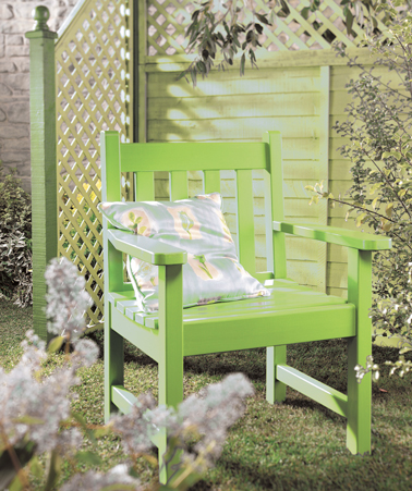 Lorsque le moment est venu de repeindre les fauteuils de jardin c’est l’occasion rêvée de choisir une couleur de peinture qui s’harmonisera avec la couleur du claustra et de la palissade en bois en choisissant une teinte un peu plus vive pour le beau fauteuil. Laque glycéro couleur vert anis aspect satin Astral. Pots de 0,5L et 2L Faible odeur Aspect satin Disponible en 29 teintes Lessivable. Prix : 17,90e (0,5L) 49,90e (2L). Peinture pour claustra : Lasure Extérieur & Intérieur Astral, 7 teintes prêtes à l’emploi et 130 en machine à teinter. Prix 34 € le pot de 1L.