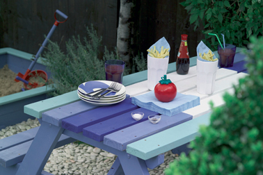 Repeindre une table de jardin en bois, des bancs avec un peinture spéciale bois extérieur pour les rénover et apporter une nouvelle protection contre les intempéries, une solution imparable pour prolonger la durée de vie du mobilier de jardin. Et lorsque les nuanciers peinture bois extérieur nous proposent de belles couleurs, difficile de résister à la tentation de personnaliser notre mobilier de jardin en le peignant de plusieurs couleurs. Comme pour cette table pique nique repeinte avec quatre couleurs de bleu et un peu de blanc au milieu pour faire le centre de table. Peinture Protect’Bois Astral aspect satin couleurs Q6.09.81, V3.19.64, V0.37.42 en machine à teinter. public : 21,95e (0,5L) et 60,90e (2,5L).