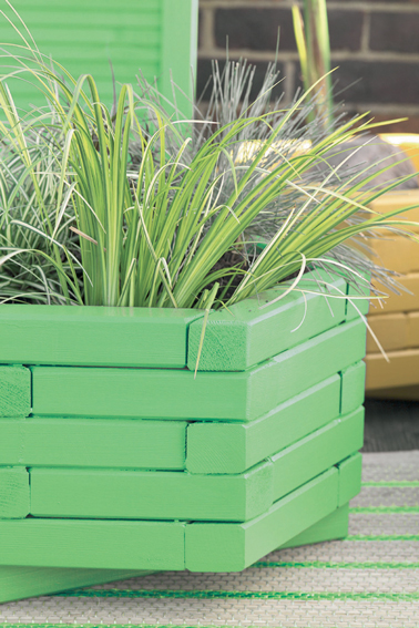 Repeindre ses volets en bois est une bonne occasion pour redonner un look d’enfer aux jardinières en bois elles aussi qui ont perdu de leur superbe. On peut peindre les jardinières de la même couleurs que les volets où comme sur la photo s’amuser avec deux couleurs de peinture qui mettront en relief les plantations qu’elles accueillent. Couleurs vert anis n° J8.41.70 et jaune n° F2.45.75 Protect’ Bois machine à teinter. aspect satin