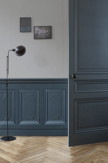 Ici, on a opté pour une peinture effet métal finition poudrée de couleur bleu Cosmos appliquée sur la porte et le lambris mural soulignée par une peinture gris perle sur le haut du mur pour un rendu hyper déco et ultra chic dans le hall d’entrée.