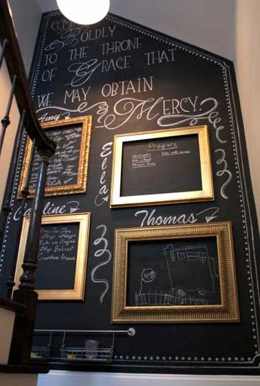 La peinture tableau noir s’adapte aussi aux petites pièces qu’elle équilibre grâce à une déco modifiable à souhait. Peindre la cage d’escalier pour l’animer avec des dessins au grès des passages dans l’escalier ou en peinture salon pour écrire des phrases dans des cadres vides contre le mur…La peinture tableau noir inspire pleins d’idées déco.