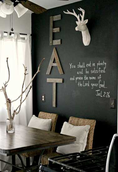 Transformez la salle à manger rapidement en appliquant deux couches de peinture tableau noir sur un mur. Ici, le mur est complètement intégré à la pièce avec ces lettres décoratives qui rappèlent les poutres et s’harmonisent avec la table en bois foncé et les chaises en osier. En touche finale, des pointes de blancs sur les coussins, les luminaires et les rideaux équilibrent l’ensemble de la pièce.