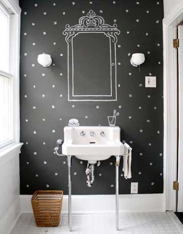 Pas besoin de beaucoup pour faire une déco WC comme nulle autre pareille. Peindre les murs avec une peinture tableau noir et dessiner dessus le décor de votre choix à la craie au dessus du lavabo blanc c’est suffisant ! Le plus déco : dessiner comme dans cet exemple des petits motifs sur toute la peinture pour donner l’illusion d’un papier peint.