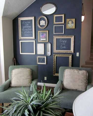 Des cadres vides suspendus contre un mur peint avec une peinture tableau noir font la déco du salon. De toutes les tailles et les formes ils créent une déco cabinet de curiosité