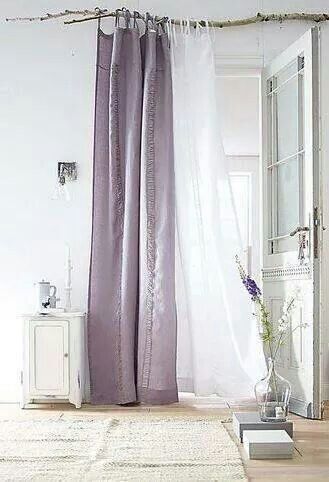 Déco chambre avec rideaux blancs et parme sur une tringle en bois flotté