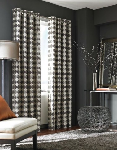 Un rideau gris et un voilage à motifs géométriques pour relooker le salon