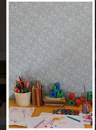 Sur une peinture bleu des murs d’une chambre, des motifs peints au rouleau donnent l’illusion du papier peint.