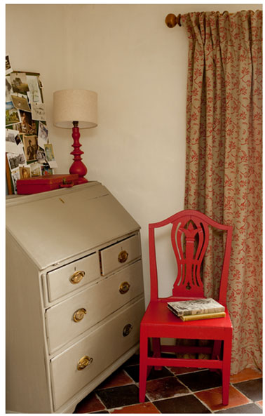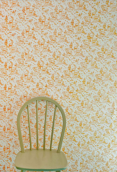Sur une peinture de chambre beige une décor style Laura Ashley réalisé avec un rouleau à motifs et une peinture orange