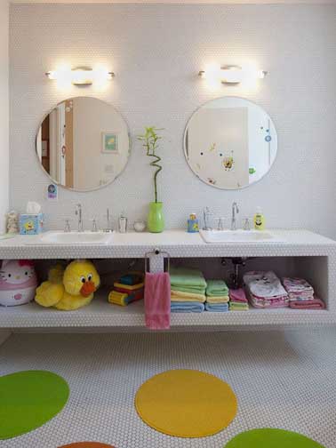 Elle favorise leur autonomie, préserve l’intimité des parents, la salle de bain dédiée uniquement aux enfants est une chose à leur offrir dès que la maison ou l’appartement le permet. Lavabo à bonne hauteur, petite baignoire ou douche pratique, pour un aménagement convenant à l’âge de l’enfant sont une bonne base d’installation. Et pour une déco salle de bain à leur goût, des couleurs gaies pour le carrelage et la peinture salle de bain, des meubles et accessoires rigolos, assurent aux enfants des moments de détente capables de rendre jaloux leurs parents… Voici une sélection de salles de bains craquantes pour bambins et ado.
