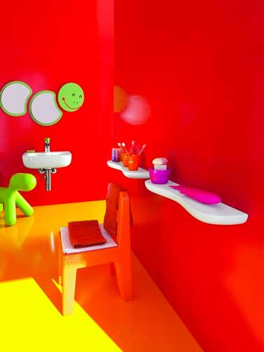 Une déco couleur salle de bain qui donne aux enfants une dose de bonne humeur dès la toilette du matin. Un rouge brillant sur les murs, jaunes sur le sol et du vert anis avec un miroir rigolo et un chien gonflable Fatboy