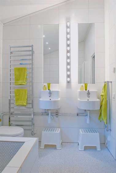 Dans leur salle de bain, les enfants aiment aussi retrouver une déco épurée comme celle de leur parents. Du carrelage et des vasques blanches, des miroirs et un porte-serviette échelle en inox avec des serviettes jaunes pour la touche de couleur.