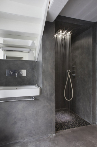 Le béton ciré, une alternative heureuse au tadelakt dans une salle de bain italienne ! Pour garantir l’étanchéité des murs et surtout ceux de la douche italienne, un mortier imperméable gris anthracite plante le décor de cette salle de bain grise. Au sol, un carrelage gris de la même nuance tandis que des galets noirs composent le sol de la douche italienne. Pour le plaisir et le confort, un ciel de pluie à Led diffuse une douce lumière blanche qui n’altère pas le gris des murs.