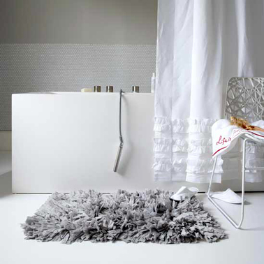 Une salle de bain grise et blanche qui mise sur le contraste des matériaux pour créer une atmosphère douce et apaisante . Comme pour faire salon dans la salle de bain, la baignoire est posée derrière un muret blanc pour laisser en premier plan un zone de détente raffinée. L’aspect sobre de l’espace bain où murs et plafond sont carrelés de mosaïque grise celui de la peinture sol gris perle est compensé par le rendu chaleureux du rideau de douche en coton blanc et celui du tapis gris à grandes mèches.