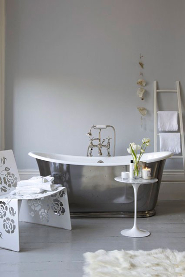 Ambiance rétro chic dans cette salle de bain grise autour de la baignoire îlot en finition étain. Aux murs, la peinture grise reprend le même ton que celui de la peinture sol qui rénove l’ancien parquet bois. Un tapis imitation fourrure blanche, une discrète décoration florale, des bougies lancent une invitation à la détente à l’heure du bain.