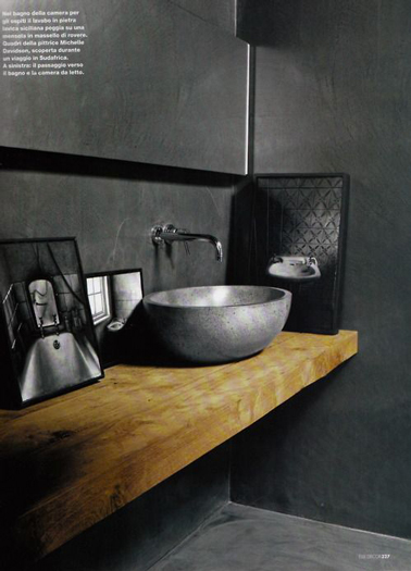 Autre ambiance dans cette salle de bain en total look béton gris anthracite et son plan vasque construit avec des poutres de chêne scellées dans le mur et protégées des méfaits de l’eau par un vernis pour bois.