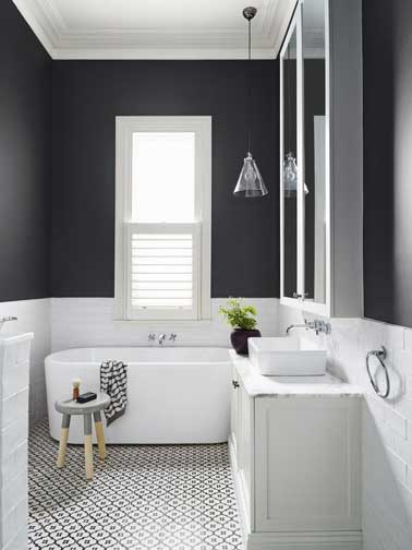 Une bonne idée que de refaire sa salle de bain avec une peinture grise et de repeindre le soubassement en blanc pour mettre en valeur une baignoire rétro !