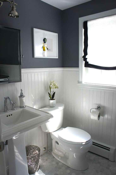 Dans une petite salle de bain bénéficiant d’une ouverture extérieure une peinture grise, même dans une teinte foncée, est tout à fait possible sur la partie haute des murs. Cela permet de profiter du côté cosy qu’apporte cette couleur sans nuire à la luminosité de la pièce. Un bon exemple avec cette salle de bain où le gris anthracite filtre légèrement la lumière et par effet de contraste met le focus sur le blanc du lambris peint et les éléments sanitaire.